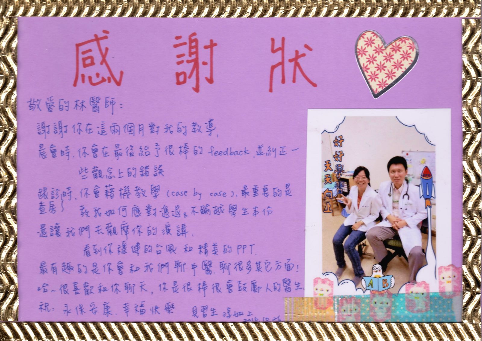 謝謝兩位中醫學生的感謝狀。(太有心了,好漂亮的感謝狀)